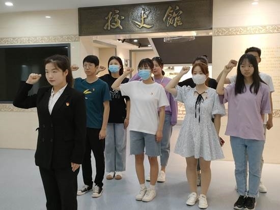 结束参观之后,学生党支部带领全体党员们重温入党誓词,以唤醒全体党员“最初的记忆”,不忘本心,不改初衷。全体党员面对鲜红的党旗,高举右手,宣誓共产党人坚定的理想信念:“我志愿加入中国共产党,拥护党的纲领,遵守党的章程,履行党员义务,执行党的决定,严守党的纪律,保守党的秘密,对党忠诚,积极工作,为共产主义奋斗终身,随时准备为党和人民牺牲一切,永不叛党。”短短十二句入党誓词,句句千钧,铿锵有力的宣誓声,让党员们再一次接受了深刻的党性教育和灵魂洗礼,坚定一心向党的崇高信念,坚持践行党的宗旨,誓为党和人民的事业奋斗终生。