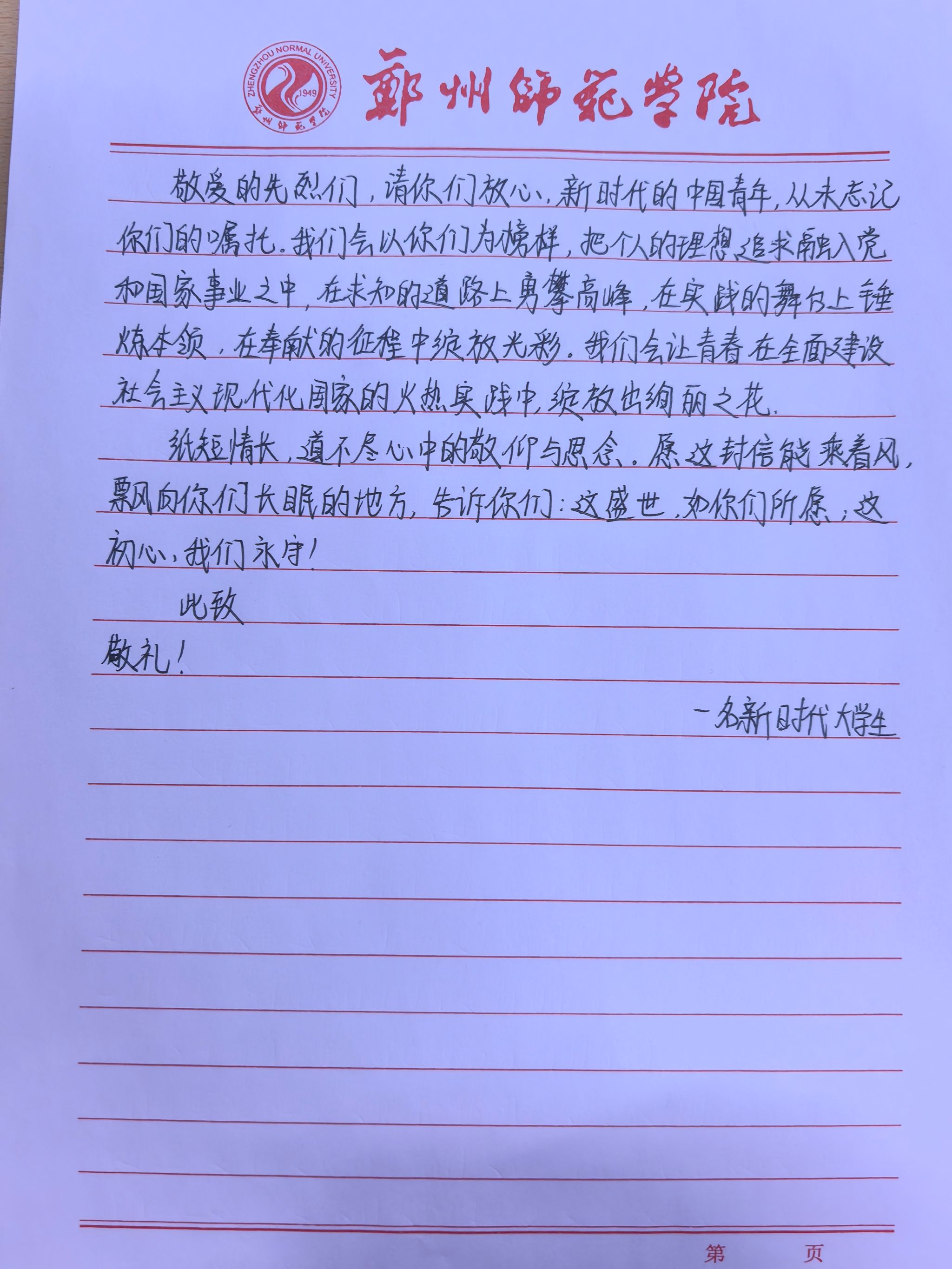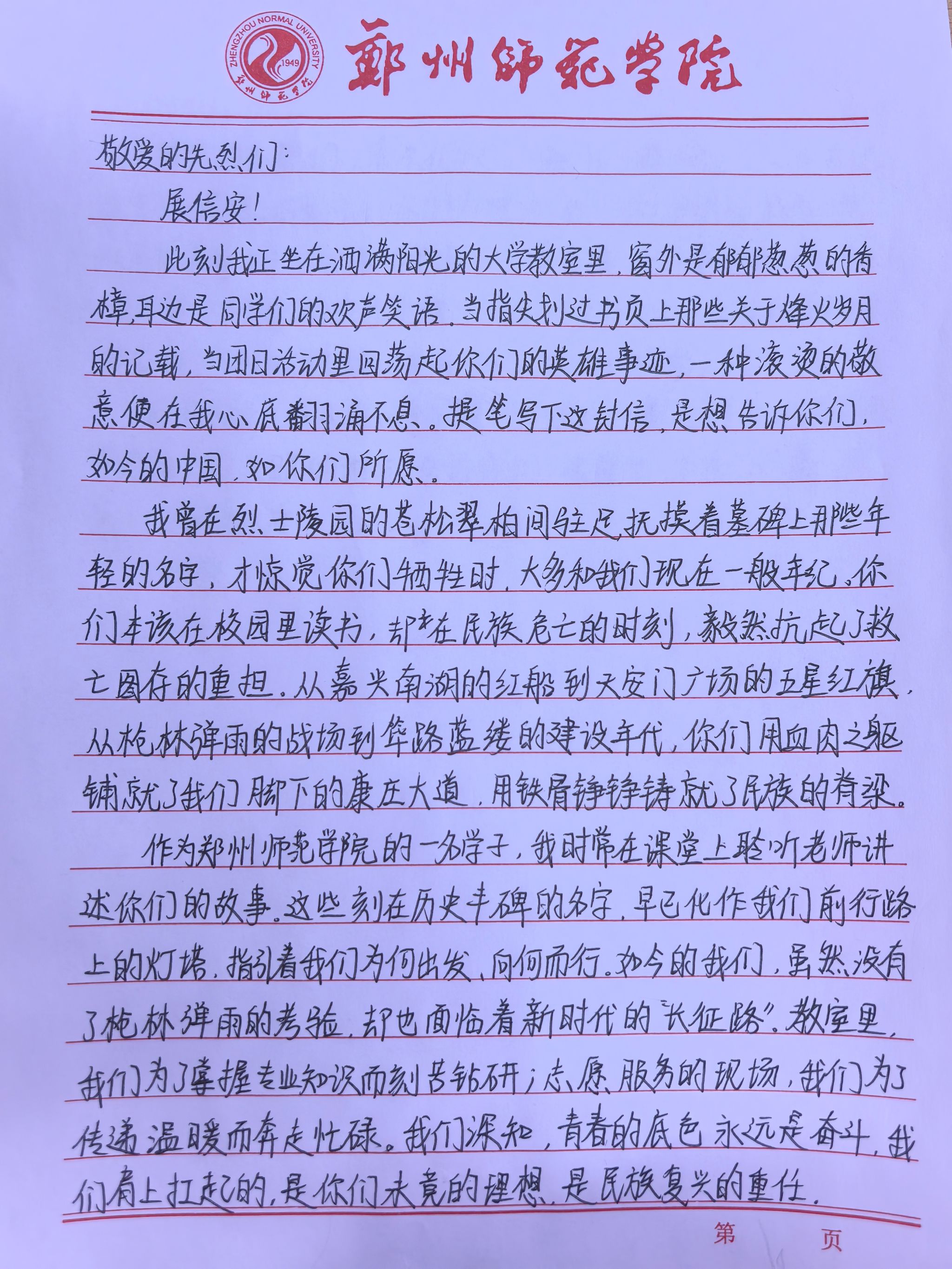 在“以信寄志”环节中,同学们提笔落字,将对先烈的真挚缅怀、对革命精神的崇敬之情倾注于信纸之上。这些书信不仅承载着新时代青年对先烈的深切告慰,更传递着接续先辈未竟事业的决心。同学们在字里行间中明确表达了继承革命精神的坚定立场,把先辈为民族独立、人民解放奋斗的理想内化于心、外化于行,立志以青春之我投身时代洪流,用实际行动践行“请党放心,强国有我”的庄严承诺,在民族复兴征程上勇毅前行。