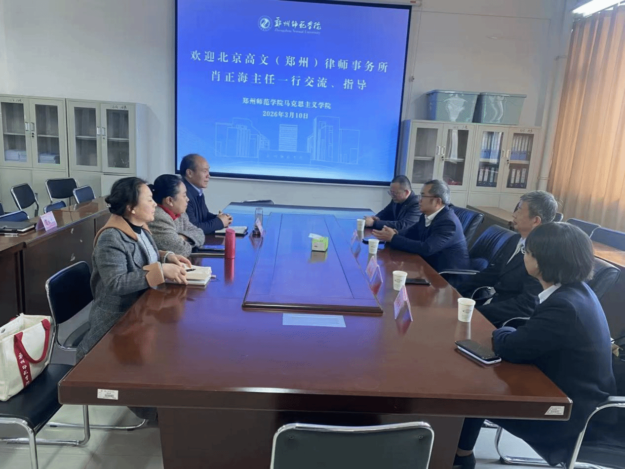 报告会后,高文律师郑州办公室肖正海主任一行与我院班子成员在会议室举行交流座谈。双方围绕“法治教育资源共建共享”、“思政教育与法学实践融合”、“青年法治素养培育”等议题展开探讨,为后续校所合作搭建常态化沟通桥梁。